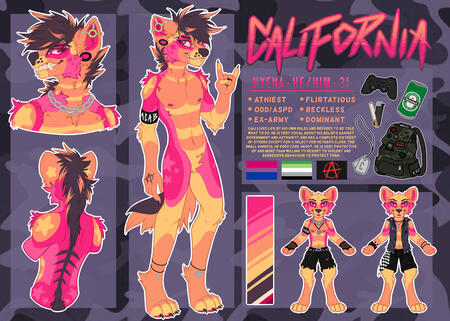 - One fullbody, colour palette, close ups of eyes and paw pads, and basic info.